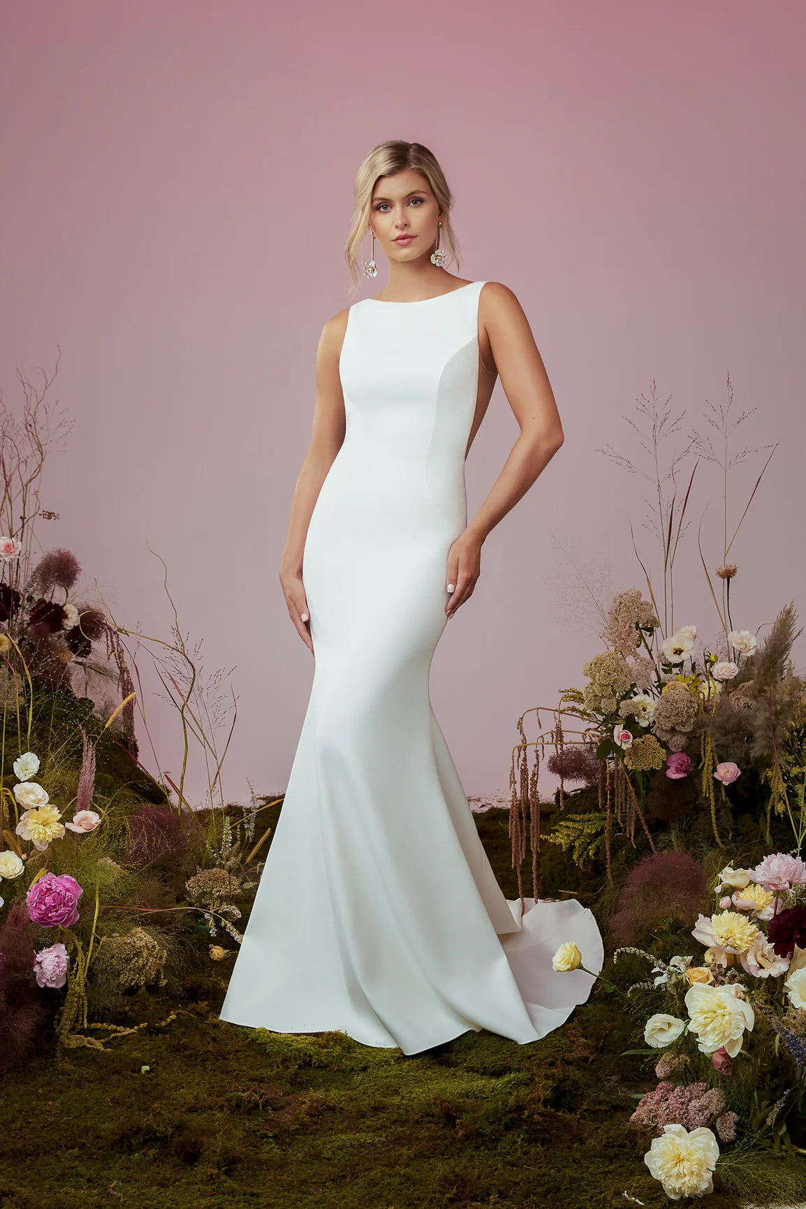Bateau neck fit & flare gown of stretch crepe with striking illusion tulle back bodice highlighted with buttons to the hem
